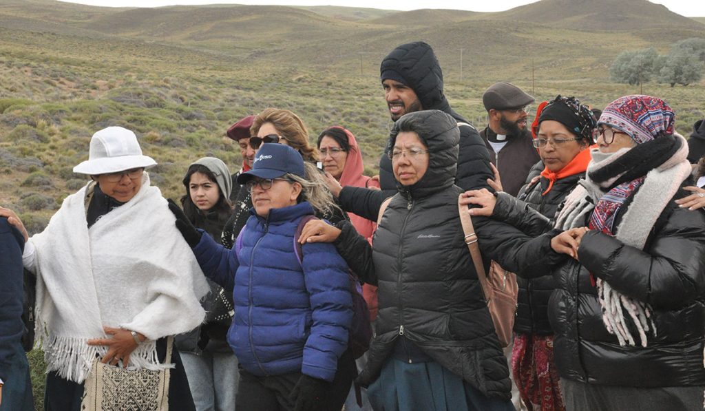 Luego de la caminata de casi 3 kilómetros, en la explanada frente al kultrum se realizó la rogativa mapuche. Primero, se llevó la urna con los restos del P. Antonio Mateo al altar de piedra al aire libre. Invitando a todos los peregrinos a mirar hacia el este, punto por donde sale el sol como lugar de renovación, de esperanza y de conexión con el mundo espiritual, en mapudungun, la comunidad mapuche inició la rogativa. Al grito de “afafán” —que expresa alegría, entusiasmo y aliento, utilizado comúnmente durante sus ceremonias— dio inicio a esta celebración que, en la espiritualidad indígena, es un espacio de comunión con la trascendencia: hay una comunicación directa con la trascendencia, hay una comunicación directa con los hermanos, hay una comunicación directa con la Creación y con la tierra, y hay una comunicación directa consigo mismo.