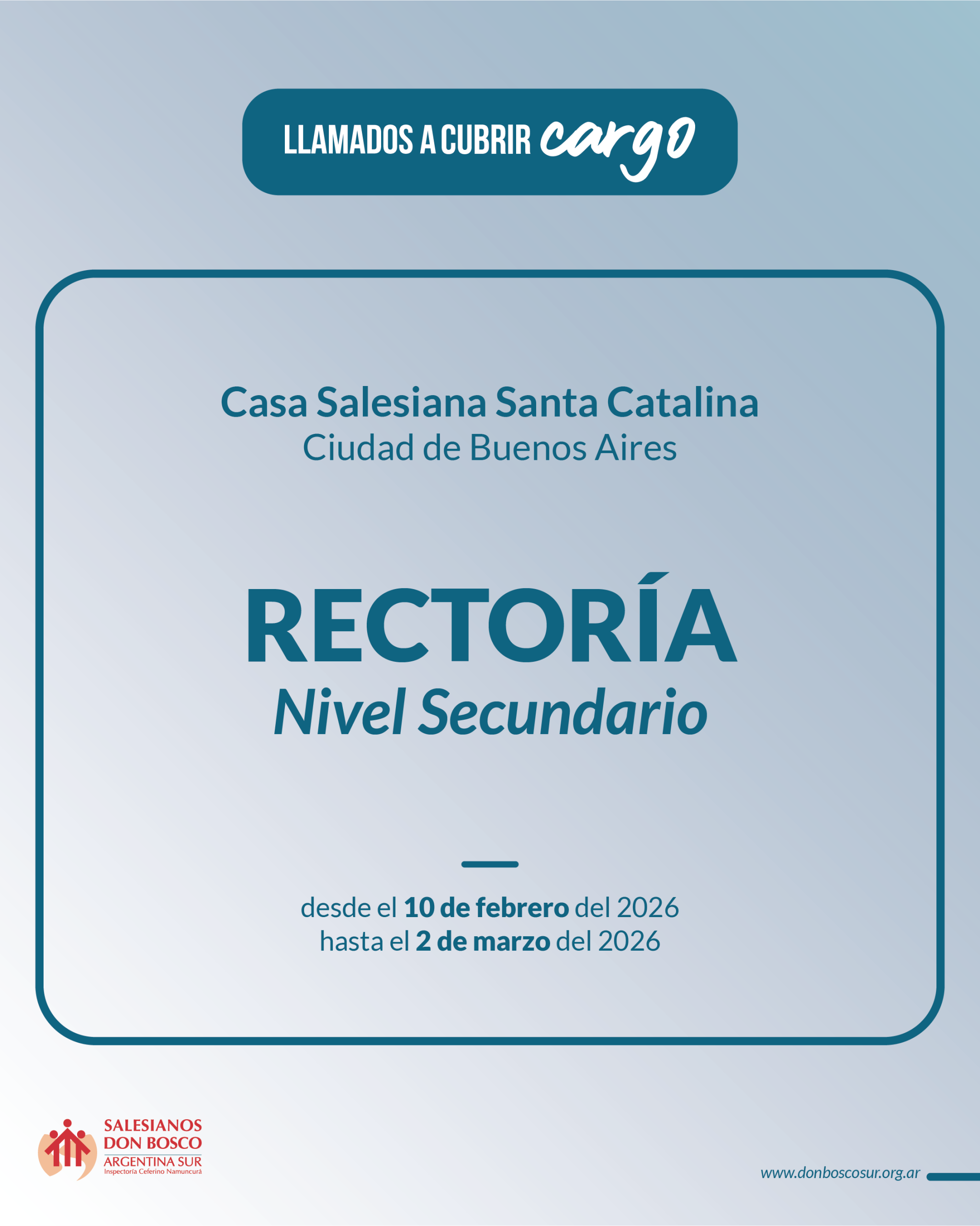 Del 10 de febrero al 2 de marzo del 2026 está abierto el proceso de convocatoria y selección de aspirantes para la cobertura del cargo de Rectoría del Nivel Secundario de la Casa Salesiana Santa Catalina de la Ciudad de Buenos Aires.