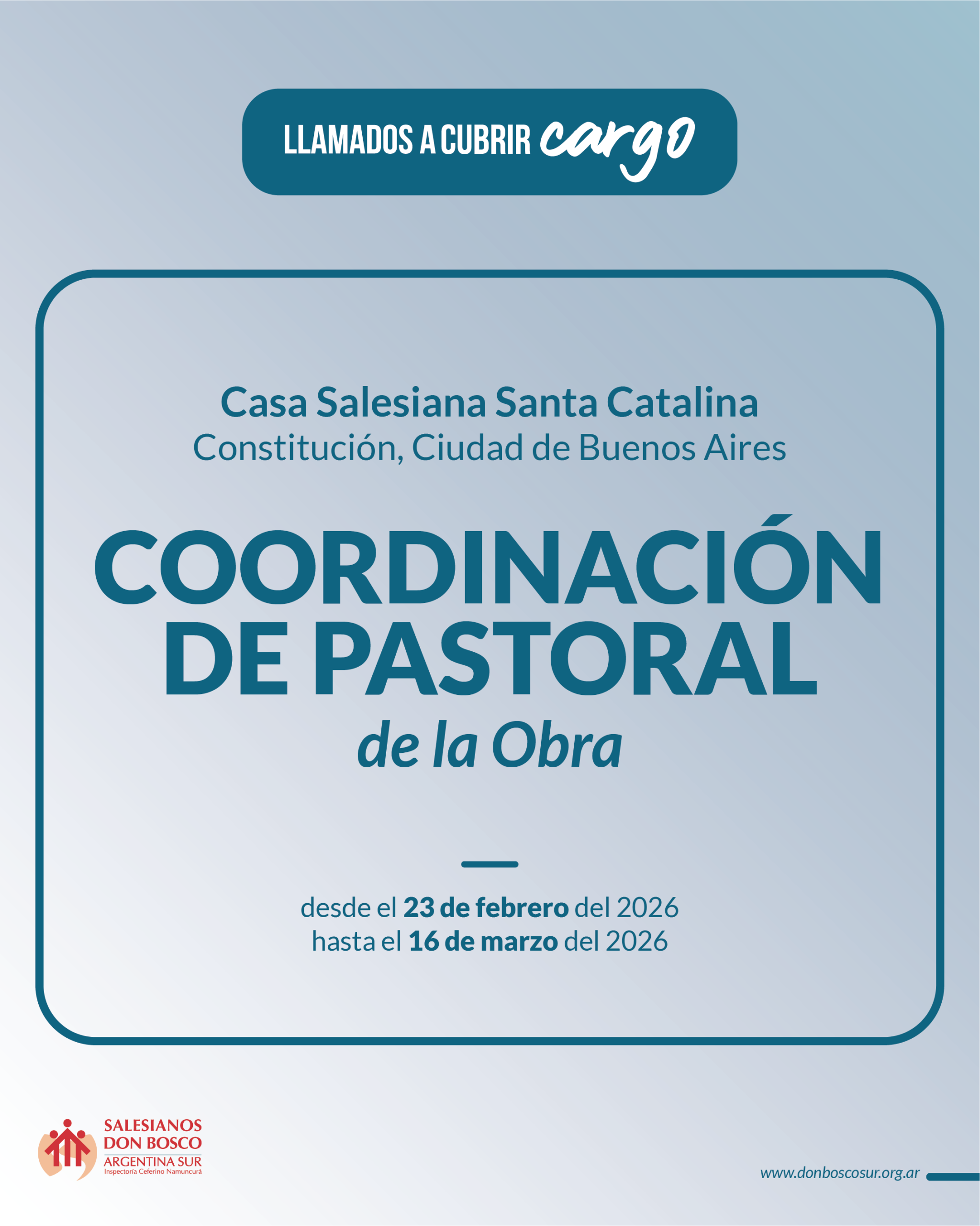 Del 23 de febrero al 16 de marzo del 2026 está abierto el proceso de convocatoria y selección de aspirantes para la cobertura del cargo de Coordinación de Pastoral de Obra de la Casa Salesiana Santa Catalina de la Ciudad de Buenos Aires.