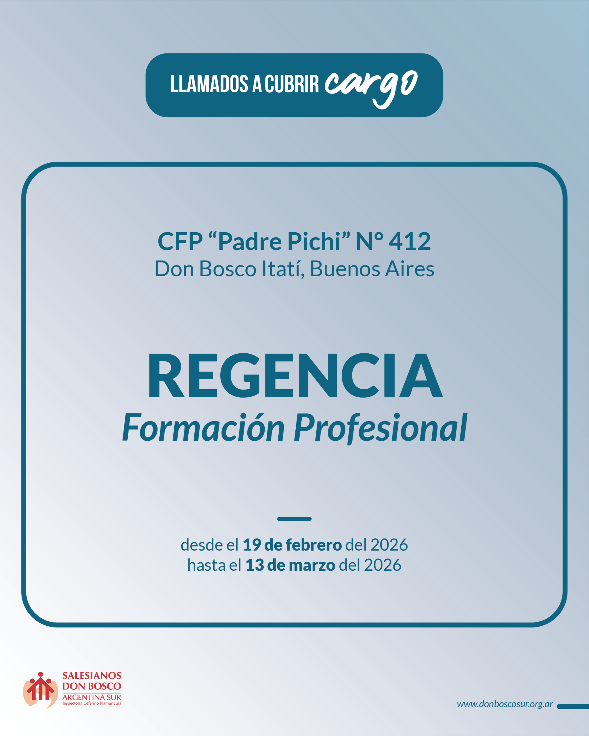 Del 19 de febrero al 13 de marzo del 2026 está abierto el proceso de convocatoria y selección de aspirantes para la cobertura del cargo de Regencia del Centro de Formación Profesional “Padre Pichi” N°412 de Don Bosco Itatí, Buenos Aires.