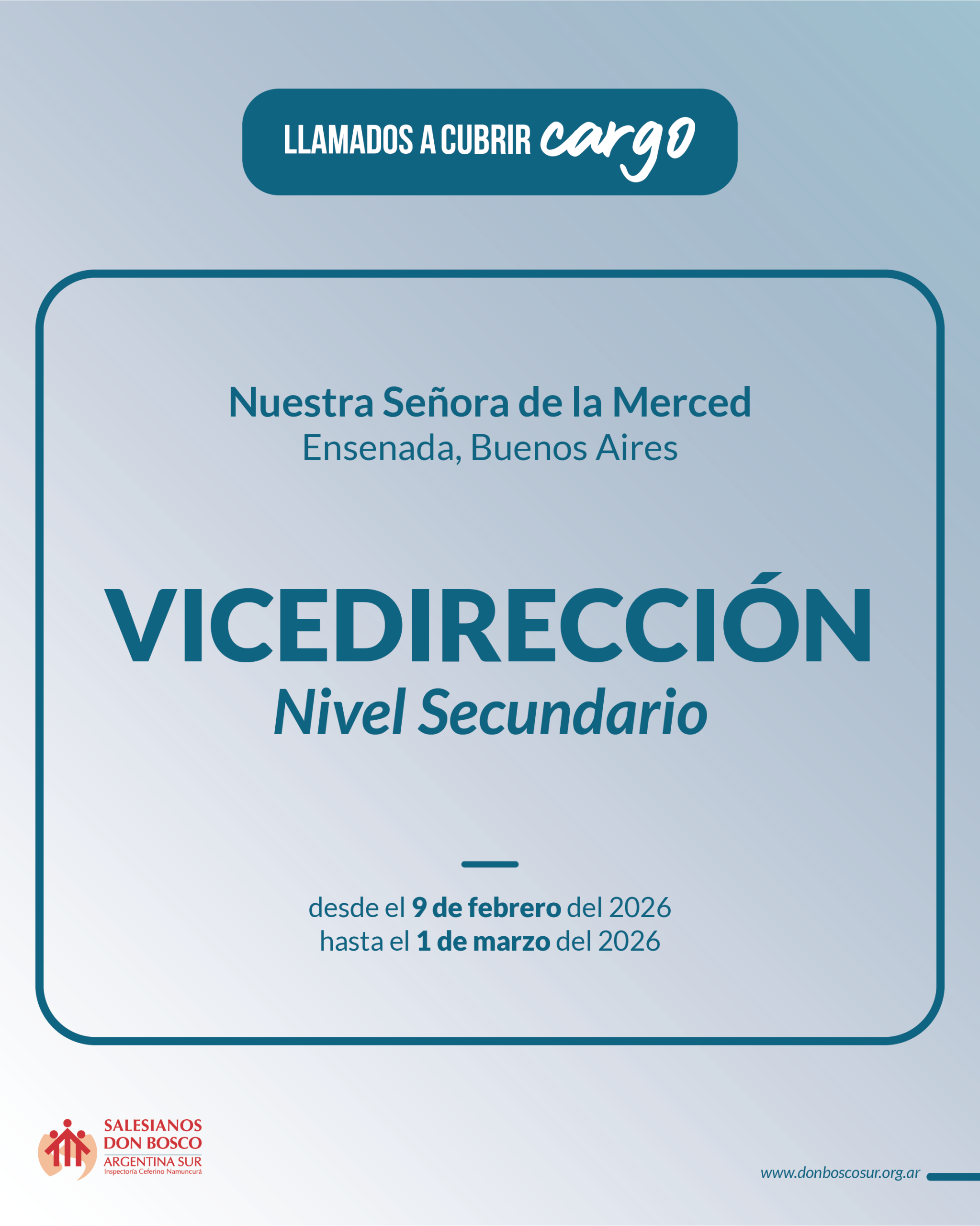 Del 9 de febrero al 1 de marzo del 2026 está abierto el proceso de convocatoria y selección de aspirantes para la cobertura del cargo de Vicedirección del Nivel Secundario de la Casa Salesiana Nuestra Señora de la Merced de Ensenada, Buenos Aires.