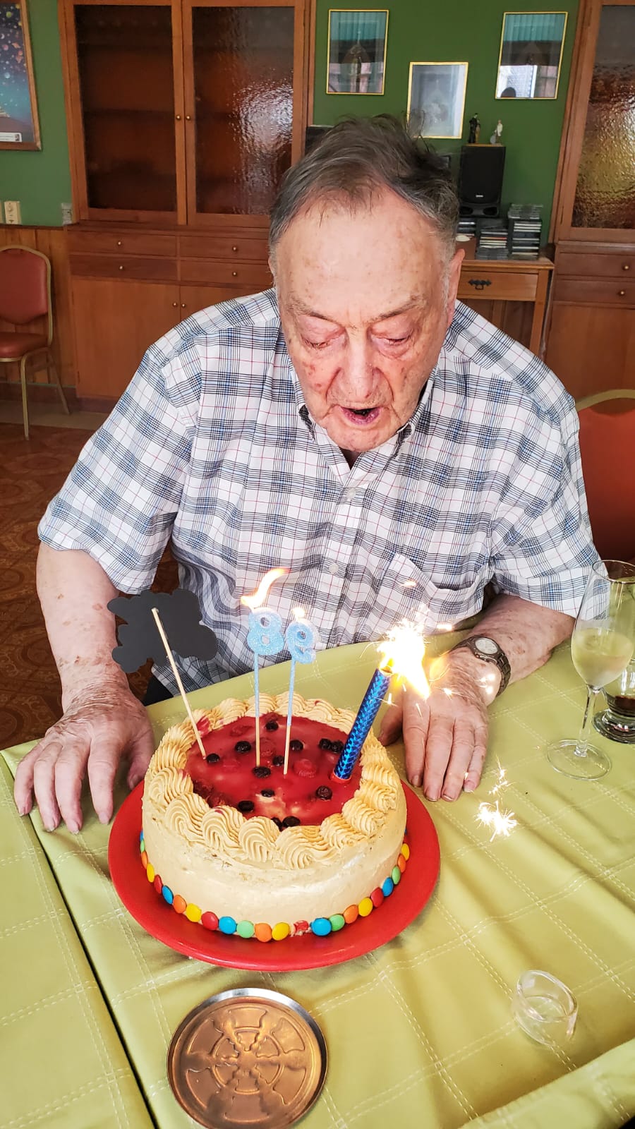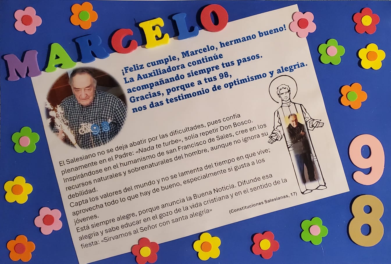 “¡Feliz cumple, Marcelo, hermano bueno! La Auxiliadora continúe acompañando siempre tus pasos. Gracias porque, a tus 98 años, nos da testimonio de optimismo y alegría”, dice la tarjeta que prepararon para la ocasión sus hermanos de comunidad.