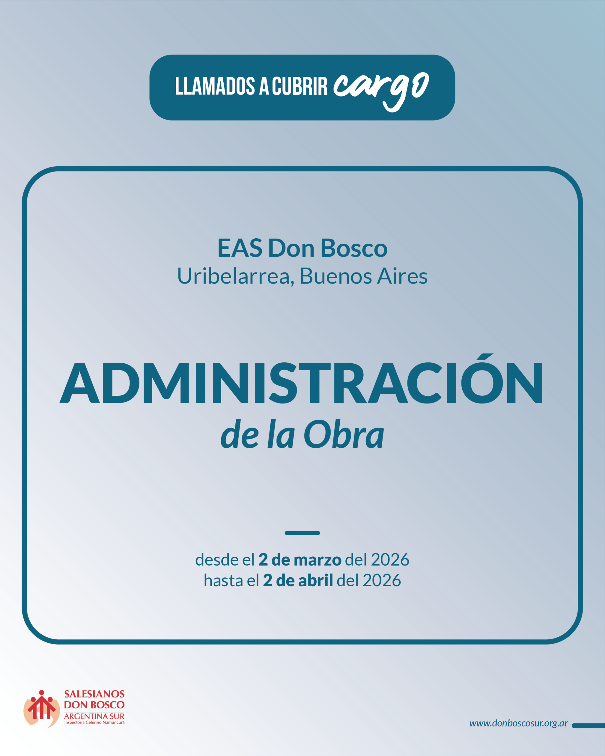 Del 2 de marzo al 2 de abril del 2026 está abierto el proceso de convocatoria y selección de aspirantes para la cobertura del cargo de Administración de Obra de la Escuela Agrotécnica Salesiana Don Bosco de Uribelarrea.