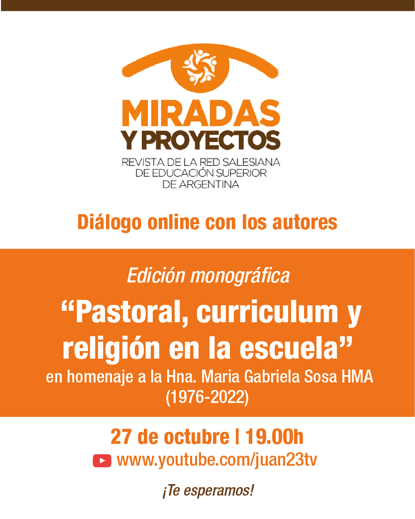Esta es una edición monográfica titulada “Pastoral, curriculum y religión en la escuela”, en homenaje a la Hna. Maria Gabriela Sosa HMA (1976-2022), en donde se ahonda en la reflexión de experiencias interdisciplinares, de la apertura a lo trascendente, de la explicitación de la fe, de la enseñanza religiosa en la escuela y de la habilidad espiritual.