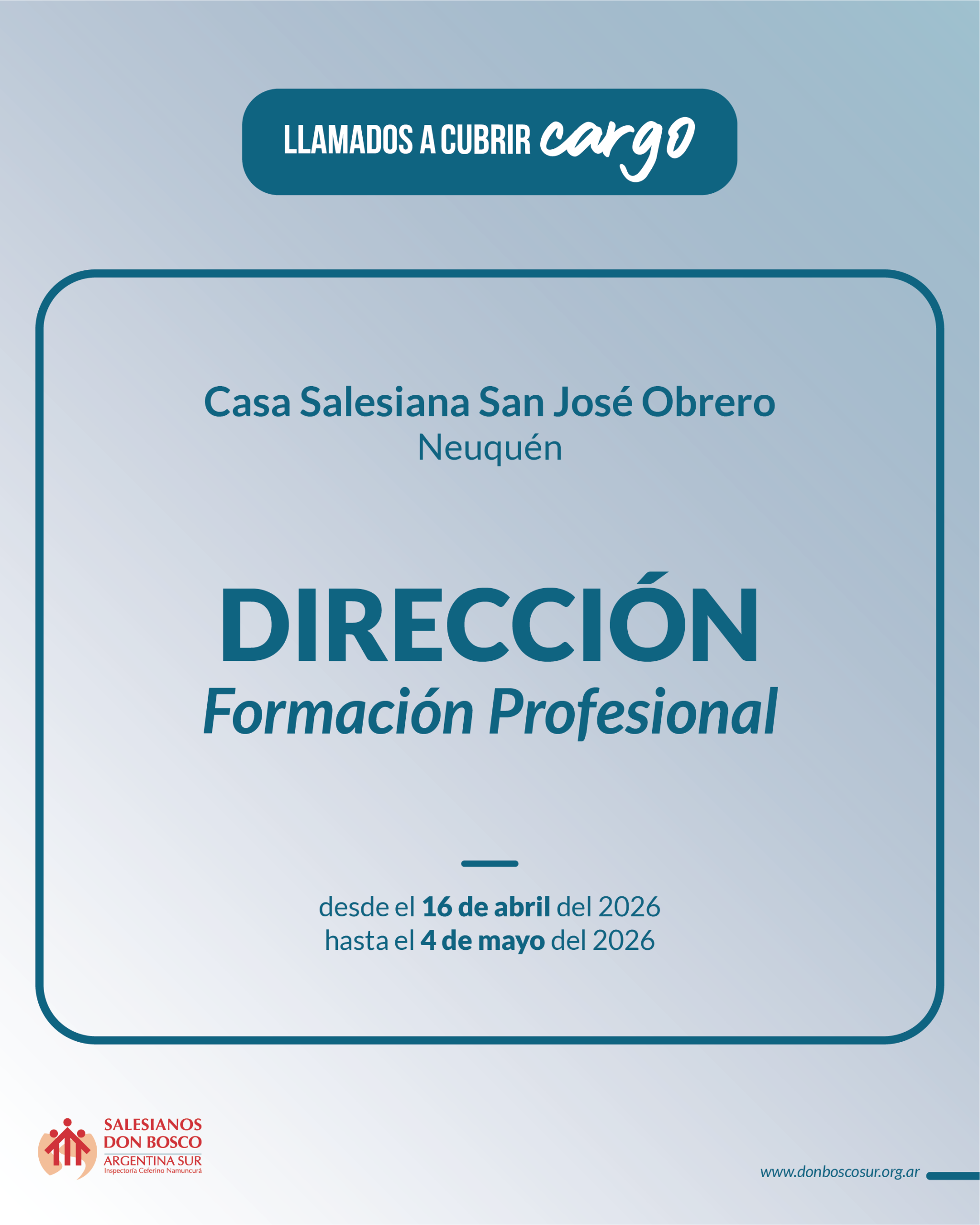 Del 16 de abril al 4 de mayo del 2026 está abierto el proceso de convocatoria y selección de aspirantes para la cobertura del cargo de Dirección del Centro de Formación Profesional del Casa Salesiana San José Obrero, Neuquén.