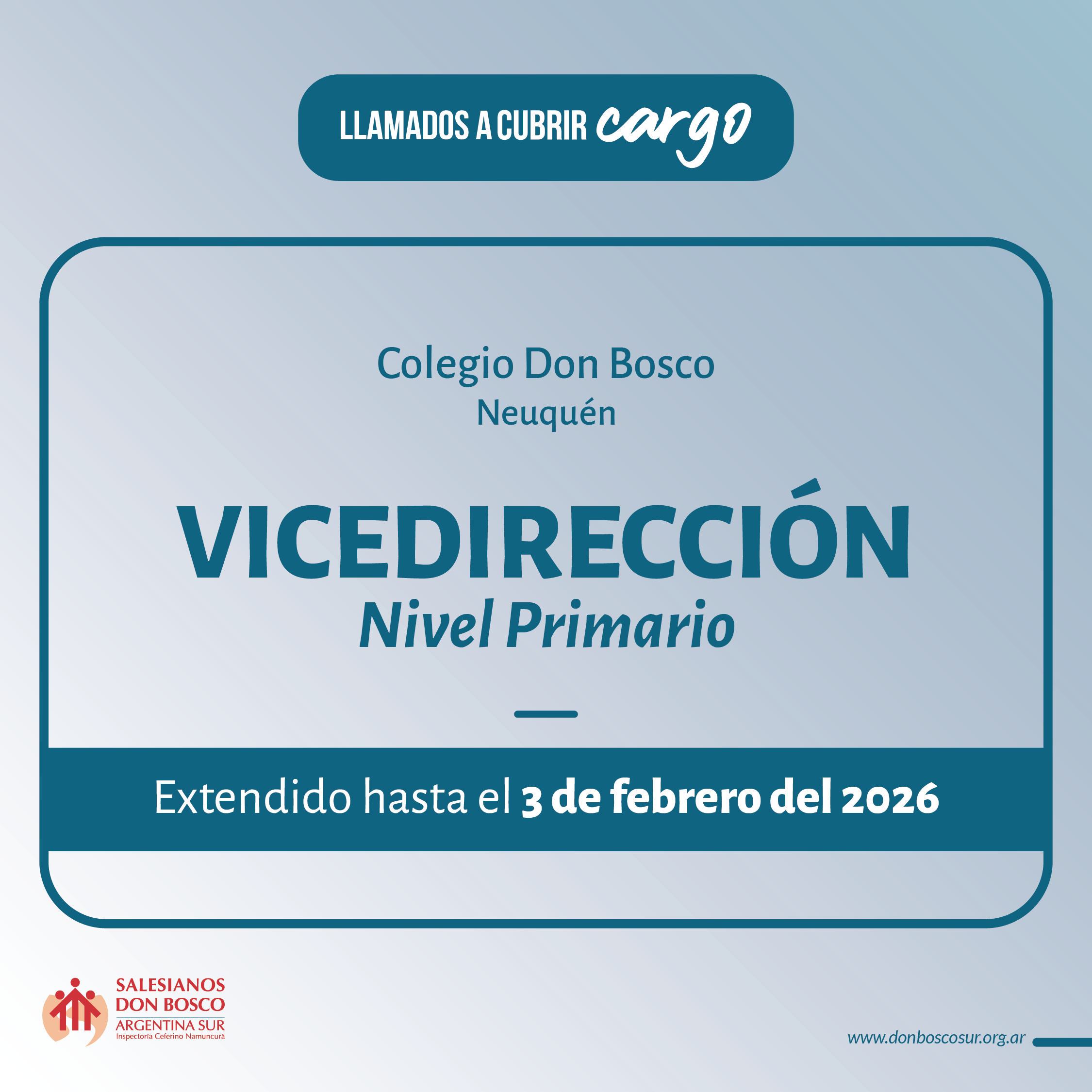Hasta el 3 de febrero del 2026 se extiende el proceso de convocatoria y selección de aspirantes para la cobertura del cargo de Vicedirección de Nivel Primario del Colegio Don Bosco de Neuquén.