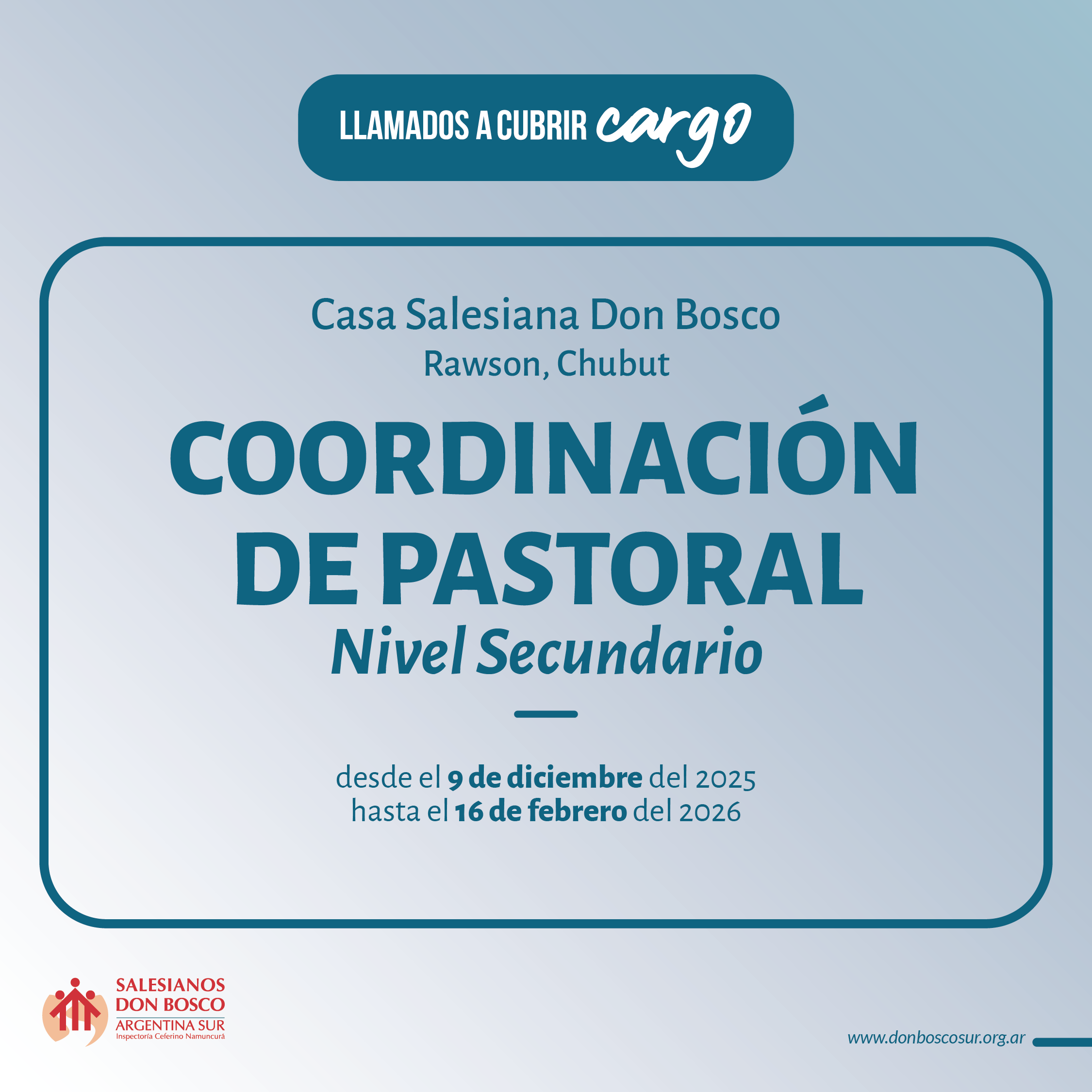 Del 9 de diciembre del 2025 al 16 de febrero del 2026 está abierto el proceso de convocatoria y selección de aspirantes para la cobertura del cargo de Coordinación de Pastoral de Nivel Secundario de la Casa Salesiana Don Bosco Don Bosco de Rawson, Chubut.