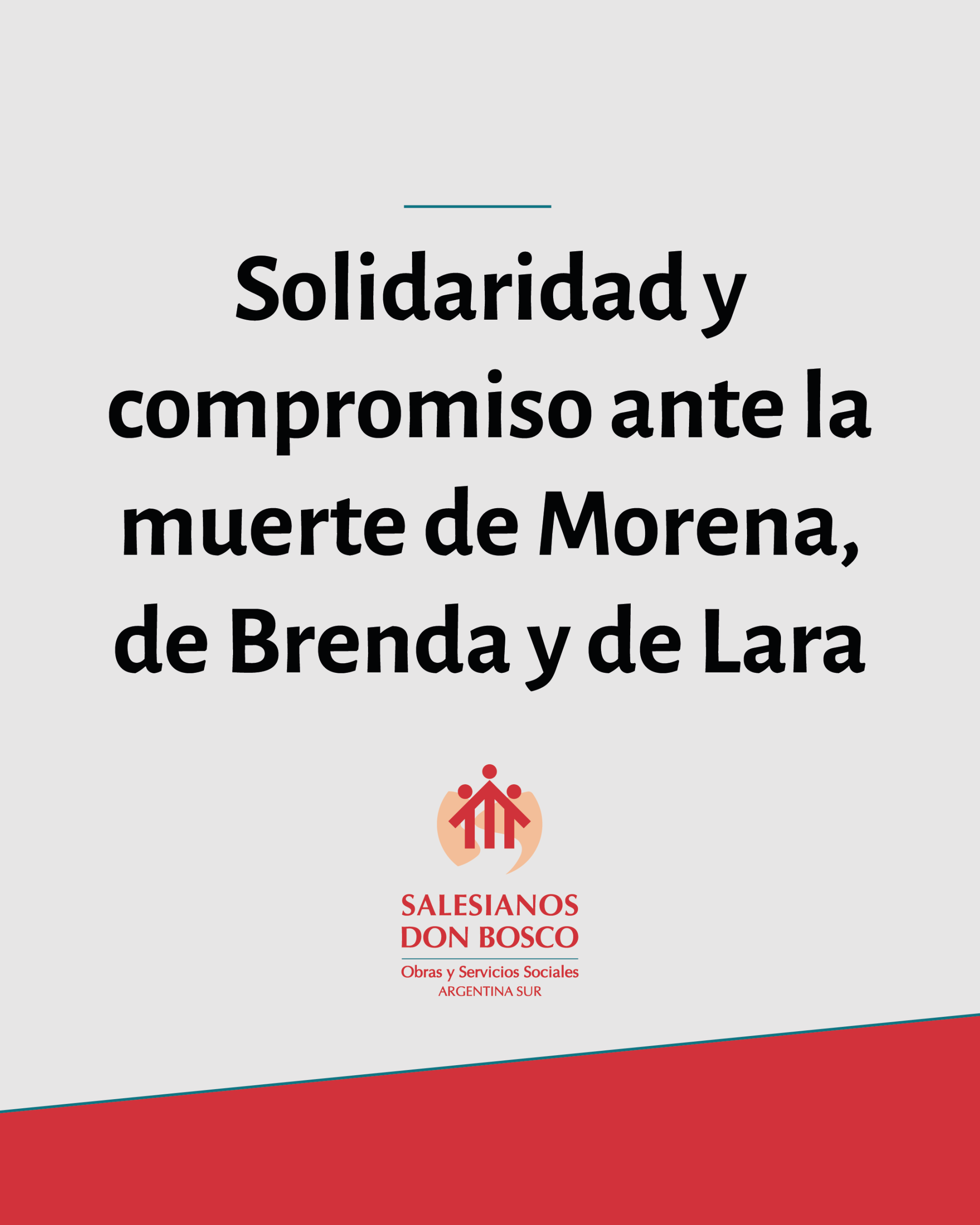 Como parte de la Iglesia, los Salesianos de Don Bosco queremos expresar nuestro profundo dolor por el desprecio de la vida y el maltrato de la niñez y de la juventud. La reciente muerte de Morena Verdi, Brenda Loreley Del Castillo y Lara Morena Gutiérrez, víctimas de un crimen brutal que enluta a sus familias, a toda nuestra sociedad y, especialmente, a quienes trabajamos incansablemente por los derechos de niños, niñas, adolescentes y jóvenes.