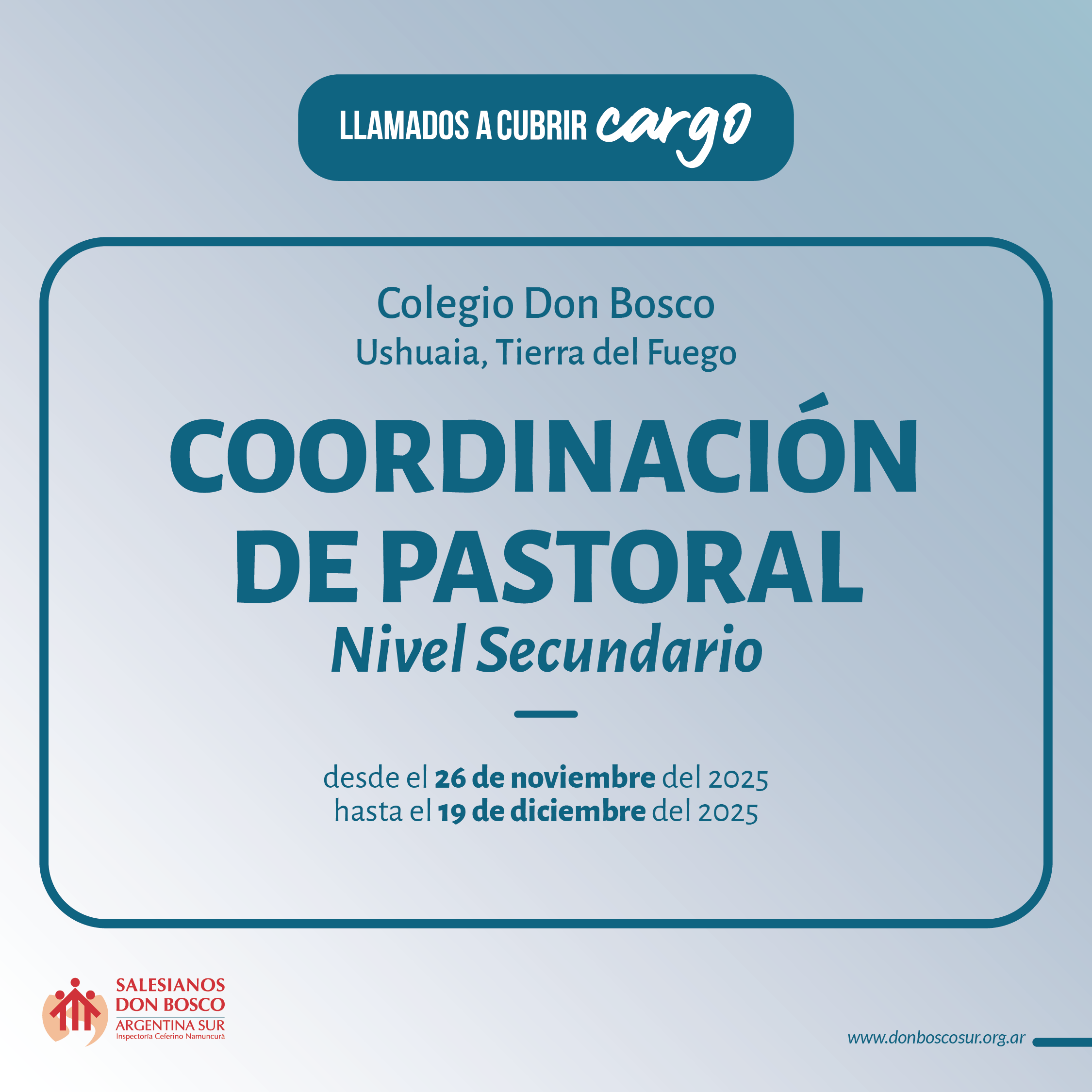 Del 26 de noviembre al 19 de diciembre del 2025 está abierto el proceso de convocatoria y selección de aspirantes para la cobertura del cargo de Coordinación de Pastoral de Nivel Secundario del Colegio Don Bosco de Ushuaia, Tierra del Fuego.