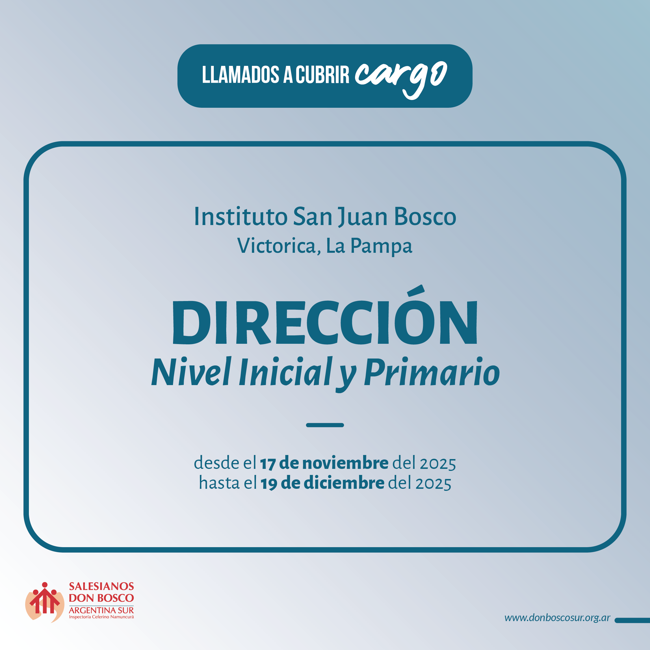 Del 17 de noviembre al 19 de diciembre del 2025 está abierto el proceso de convocatoria y selección de aspirantes para la cobertura del cargo de Dirección de Nivel Inicial y Primario del Instituto Don Bosco de Victorica, La Pampa.