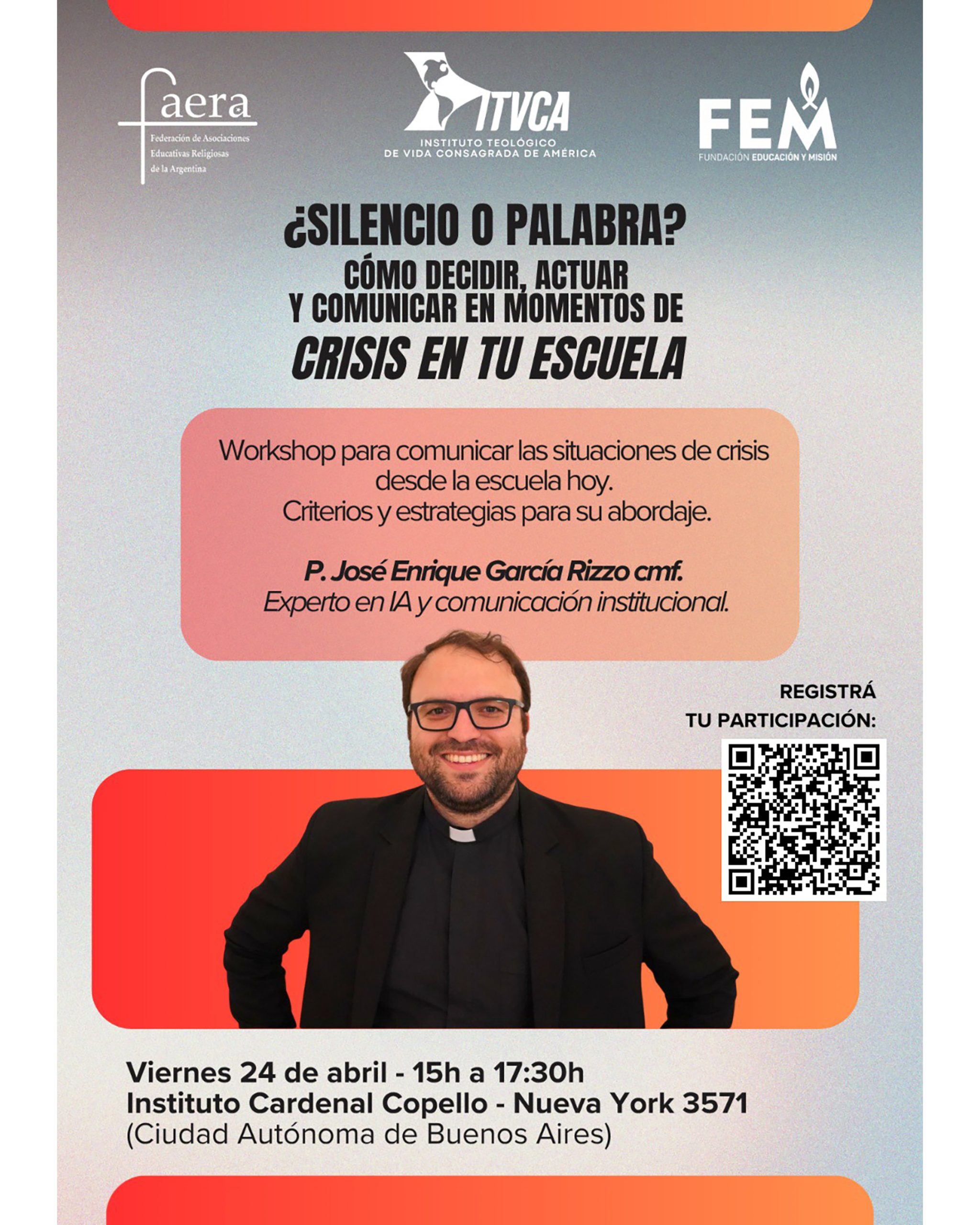 La Federación de Asociaciones Educativas Religiosas de la República Argentina (FAERA), el Instituto Teológico de Vida Consagrada de América (ITVCA) y la Fundación Educación y Misión (FEM) invitar a participar del workshop ¿Silencio o palabra? Cómo decidir, actuar y comunicar en momentos de crisis en tu escuela.